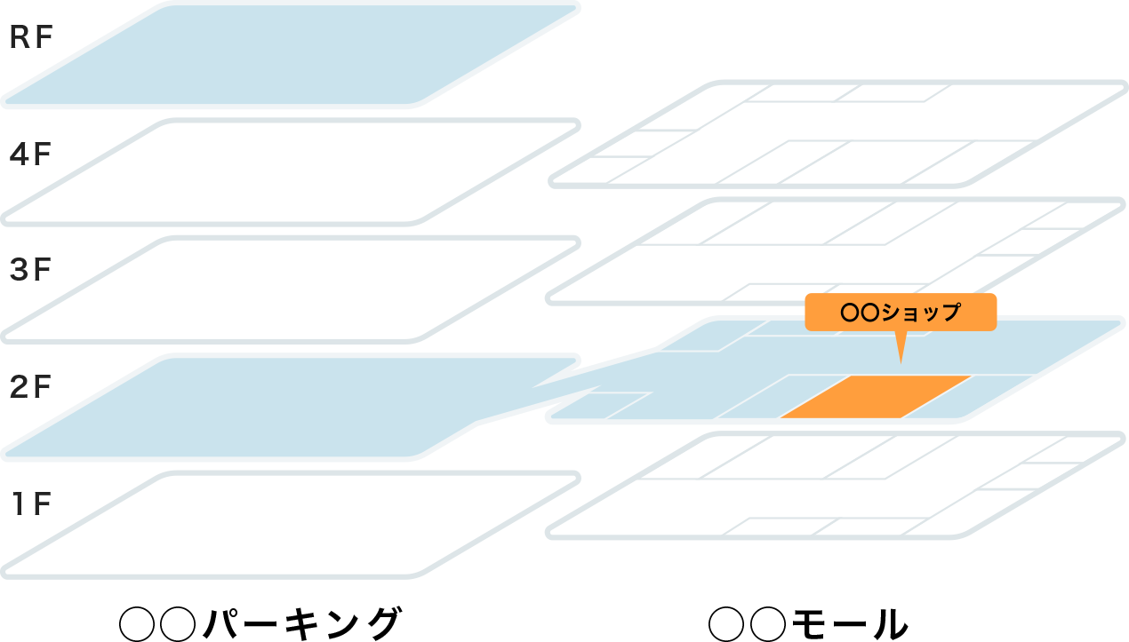 ビーコンを駐車場の天井に10m間隔で配置することで、屋内の大まかな位置を測位できるので導入コストを抑えることができます。